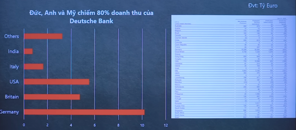 Mặc dù là một ngân hàng toàn cầu nhưng các hoạt động của DeutscheBank lại rất tập trung. Hơn 80% doanh thu chỉ tập trung ở các thị trường Đức, Anh, Mỹ.