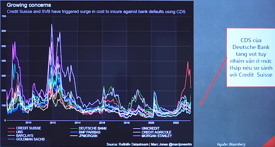 Vào thứ Sáu (24/3), cổ phiếu của Deutsche Bank sụt giảm trong khi chi phí bảo hiểm chống vỡ nợ (CDS) tăng vọt. Ngân hàng này bị “nhấn chìm” bởi sự hoảng loạn tại thị trường của khu vực ngân hàng châu Âu. Deutsche Bank là một trong những ngân hàng lớn trên thế giới, với các dấu ấn lớn trong giao dịch trái phiếu và công cụ phái sinh tiền tệ ở Phố Wall.