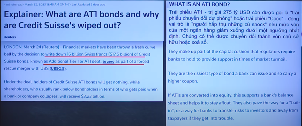 - Trái phiếu AT1 (trái phiếu có khả năng biến đổi thành cổ phần nếu như vốn cấp 1 bị sụt giảm về 1 tỷ lệ nào đó) dẫn tới tâm lý của NDT bán tháo khỏi các ngân hàng có khẩu vị đầu tư mạnh bạo